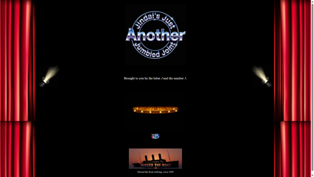 So I thought I’d take that name and make it a website. And then I thought OK what is gonna be the name of this site. And I got really alliterative and cutesy, and called it Jindai’s Just Another Jumbled Joint. I was at theater student, so of course it was somewhat theater themed. Klieg lights along the side lighting up the WordArt logo that Debi made for me. A little artsy thing because there were tools back then to help you design websites and they put their own little watermark in your code. A little dividing line made of blinking LEDs (simulated) and it was ready to launch. It was just a spare 19 or so lines of code padded to like 29 or 34 depending on how and when I put extra spacing into it. And when I say I, it’s all Debi. She was an expert in WordArt, and she was better with HTML than I was. So she helped me launch that site in a very significant way.